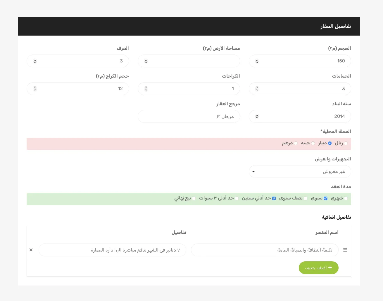 أدخل تفاصيل العقار الأساسية وحدد العملة ومدة العقد