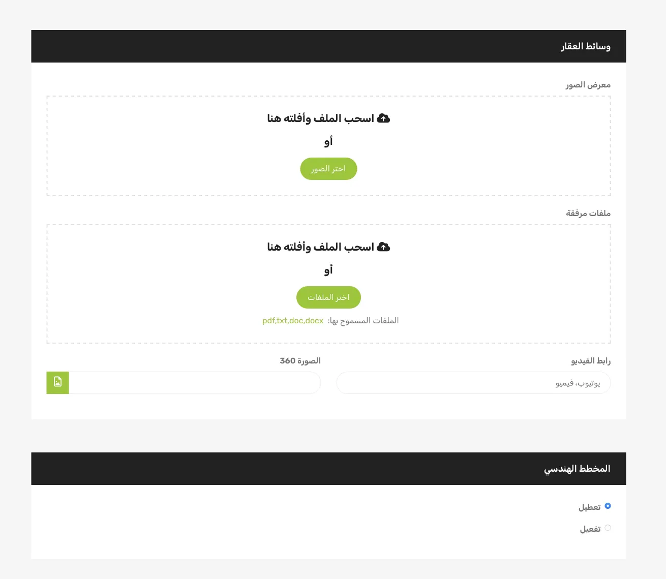 يمكنك سحب الصور وافلاتها في المربع أو النقر على زر الإضافة واختيارها من بين الملفات. يمكنك ايضا اضافة رابط فيديو سواء من يوتيوب أو من اي مصدر آخر. بالنسبة للمخطط الهندسي هذا على الأرجح ينفع كثيرا في عمليات المعروض للبيع حيث يمكن رفع المخطط الهندسي وإضافة التفاصيل والخرائط المرافقة. كما تلاحظ أنت لست بحاجة لفريق عمل كبير لعرض عقاراتك بطريقة احترافية. فقط بعض الوقت والتنظيم وبعض الصورة المأخوذة بعناية.